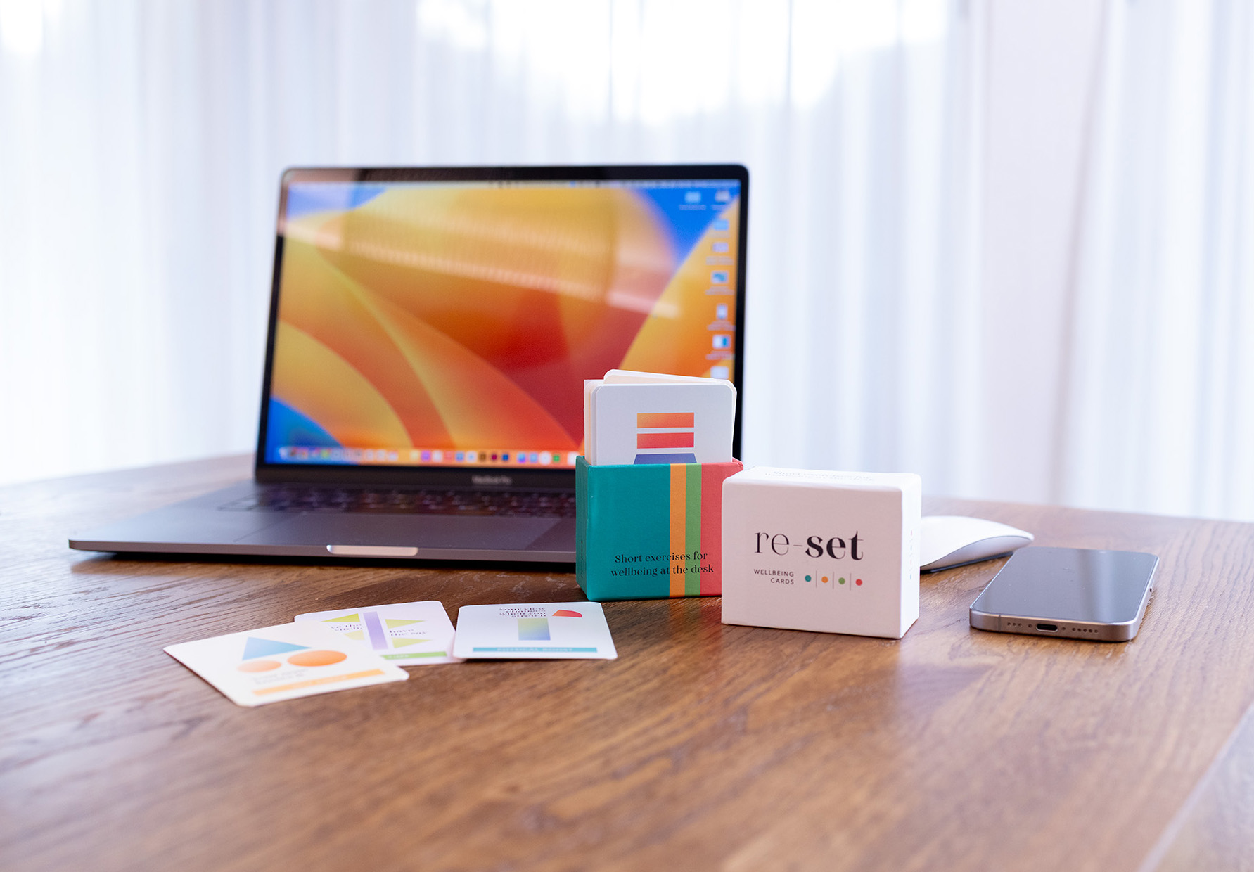 re-set Wellbeing Cards are intentionally physical and packaged in a vertical format, designed to stand on a desk and remain visible throughout the workday.